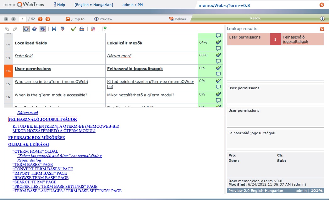 Together with memoQ 6, webTrans gets the preview functionality. It is pretty impressive, a real-time preview in a browser environment. I am not completely sure, but I think we're the first in this area as well... Just look how cool it is - real-time as in memoQ!